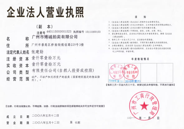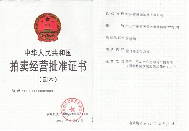 广州市博诚拍卖有限公司是经广东省经济和信息化委员会批准,经广州市工商行政管理局、广州市税务局核准登记成立具有独立法人资格的拍卖企业,是广东省拍卖业协会会员。 广州市博诚拍卖有限公司严格遵循《中华人民共和国拍卖法》等法律、法规。在拍卖活动中始终坚守“尽心服务、珍惜所托”的工作态度,本着“公开、公平、公正、诚实信用”的拍卖原则,立足广州,面向全省积极拓展拍卖业务。以优质服务、专业敬业、操作规范、诚实信用为立行之本,拥有良好的企业信誉和形象,深受各委托人、竞买人及社会各界的好评。 本公司秉承“以人为本”的管理理念,不断给员工提供培训的机会,使公司逐渐拥有一批高素质的拍卖人才队伍,适应市场的竞争。 现有国家注册拍卖师3名和一支具备良好的敬业精神和职业操守、具有丰富的从业经验和较强的协调沟通能力、热情能干的拍卖专业队伍,其中包括职业经理人1名、律师1名、旧机动车估价师1名、房地产估价师和土地估价师2名、财务管理师和会计员2名、房地产中介人员2名、拍卖从业人员4名。公司以雄厚的综合实力及完善的经营体系,向社会提供优良服务。
